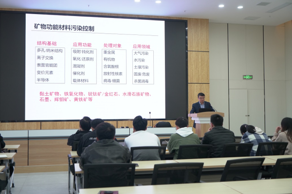 朱润良研究员课题组利用天然和改性纳米矿物,开展土壤和水污染修复治理研究,并且在环境建筑固废的处理处置和综合利用研究等方面开展了大量工作并发表了系列高水平成果。现场互动环节,参会师生就天然矿物是否对光催化反应有响应以及天然矿物对其改性后的催化剂热稳定性差等方面踊跃提问,朱润良研究员逐一予以解答,现场讨论与交流气氛热烈。